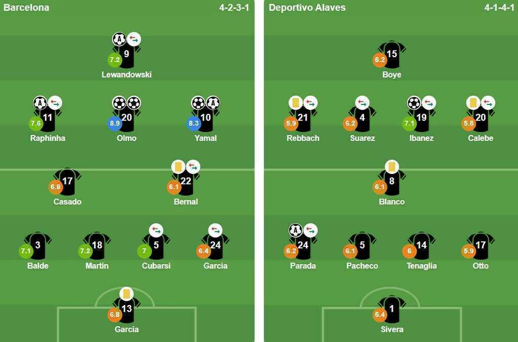 Hiệp hai diễn ra với sự thận trọng hơn từ cả hai đội nhưng cũng không thiếu những pha bóng căng thẳng. Barcelona tiếp tục kiểm soát bóng vượt trội với tỉ lệ lên đến 70%, trong khi Alaves chơi phản công. Thủ thành Sivera của Alaves có một màn trình diễn đáng khen khi liên tục phá bóng giải nguy và từ chối các cú sút từ Lewandowski, Casado và Yamal.