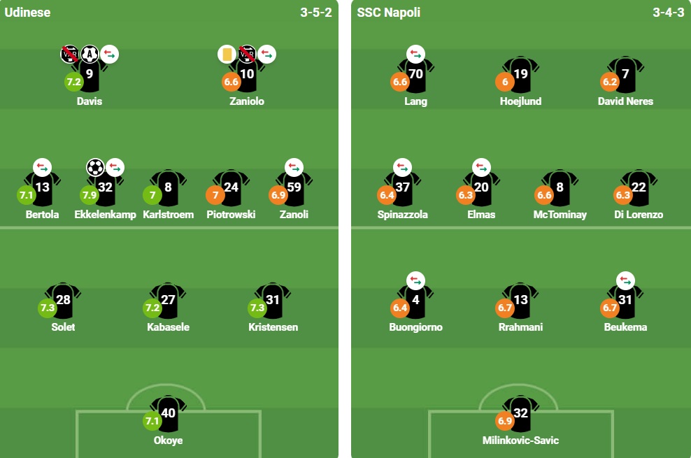 Trong những phút còn lại, Napoli vùng lên mạnh mẽ. HLV của họ tung Matteo Politano và Stanislav Lobotka vào sân, đẩy tỷ lệ kiểm soát bóng lên tới 57% nhằm tìm kiếm bàn gỡ. Các cơ hội liên tiếp được tạo ra, nhưng hàng thủ Udinese dưới sự chỉ huy của Christian Kabasele và thủ môn Okoye đã đứng vững. Udinese cũng liên tục thay người chiến thuật, đưa Adam Buksa và Oier Zarraga vào sân để câu giờ và gia cố phòng ngự.